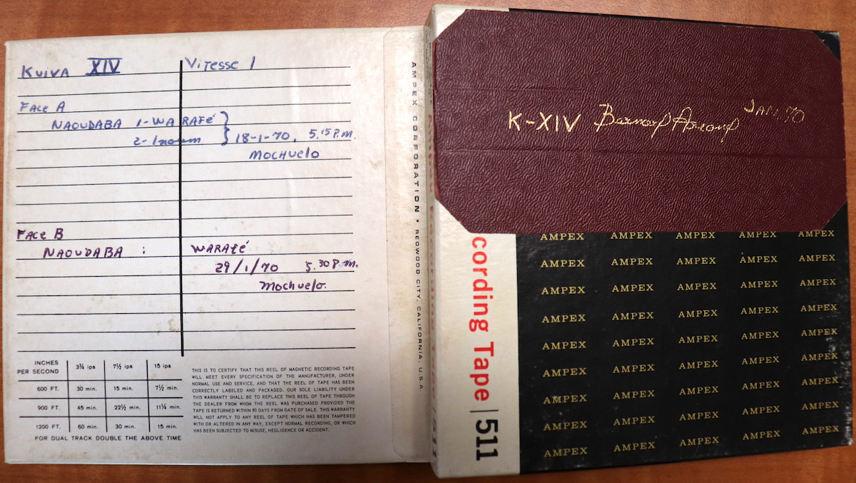 The present recording has this note: "1 PM. Metamayo: Naweba (women's song). In her place; she talks about the death of her two children, a long time ago." This is one of 30 preserved audio recordings made by French-Canadian anthropologist Bernard Arcand during his anthropological research work among the Wamonae-Cuiva of Caño Mochuelo, Casanare, Colombia, which have been preserved by his wife Ulla Hoff. The metadata for each recording correspond to Arcand's handwritten notes on the covers of the tape boxes.